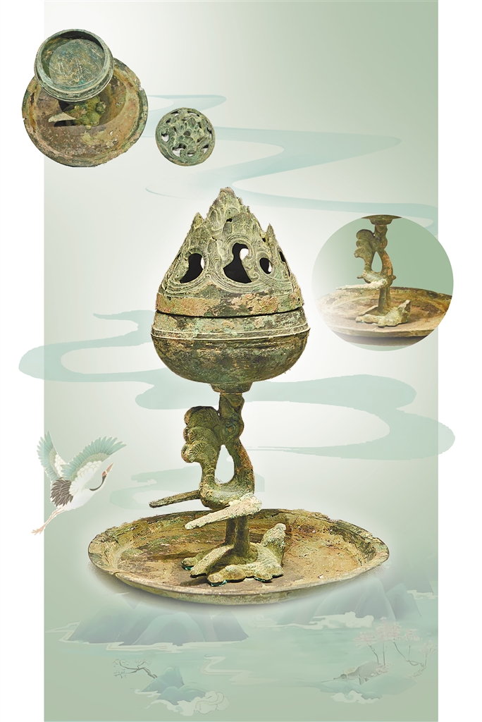 刘伟说:“镂空工艺是这尊铜博山炉的亮点。炉盖的山峦造型并非简单的浮雕,而是采用透雕镂空技法,山峦的层次、沟壑、峰峦都通过镂空手法立体呈现,最高处与最低处落差达3厘米,形成了错落有致的空间感。镂空的孔径大小不一,最小孔径仅0.3厘米,既保证透气顺畅,又满足了熏香的实用功能,还赋予器物通透雅致的视觉效果。这种镂空工艺需要工匠在铸造后对每一处镂空都要反复雕琢、打磨。”