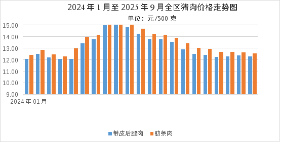 1-9月份,我区猪肉价格以降为主。据农业农村部数据显示,上半年全国生猪市场供应相对充足,尽管春节、端午等节日对下游市场有所提振,但力度有限。9月份猪带皮后腿肉、猪肋条肉全区平均价格分别为每500克12.28元、12.56元,与年初相比,猪带皮后腿肉、猪肋条肉价格分别下降10.89%、11.42%。