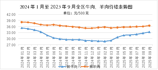 前三季度,牛肉、去骨羊肉全区平均价格分别为每500克30.98元、35.73元,同比,牛肉、去骨羊肉价格分别下降3.46%、3.25%。