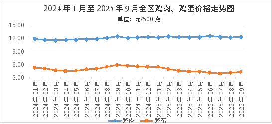 前三季度,鸡蛋、鸡肉全区平均价格分别为每500克4.36元、12.20元,同比,鸡肉价格上涨3.92%,鸡蛋价格下降11.56%。
