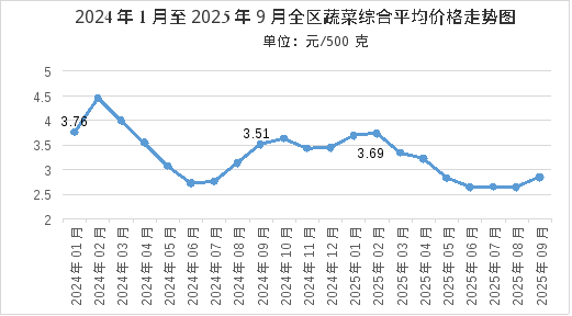 1-9月份,全区蔬菜价格波动运行。1-2月份,受天气寒冷导致蔬菜生产、运输成本较高,以及春节节日效应拉动等因素影响,我区蔬菜价格持续上涨,2月份为季节性高点,全区蔬菜综合平均零售价格为3.73元/500克。3-6月份,随着天气转暖我区蔬菜市场供应量及品种逐步增加,露地菜逐渐取代暖棚菜,本地菜逐渐取代外调菜,且蔬菜生产、运输费用不断下降,我区监测的15种蔬菜价格普遍回落。7月份受高温多雨水因素影响,我区蔬菜价格环比略升。8月份蔬菜价格回归下行通道。9月份,受中秋国庆节日效应拉动,我区蔬菜价格进入上涨通道。9月份,全区蔬菜综合平均价为2.84元/500克,与年初相比,下降23.04%。前三季度,15种蔬菜全区综合平均价格为3.07元/500克,同比下降10.76%。