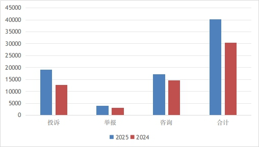 2025年10月份,内蒙古全国12315平台共接收消费者投诉、举报、咨询40280件,同比增长32.08%。其中,投诉19120件,占总量的47.47%;举报3938件,占总量的9.78%;咨询17222件,占总量的42.75%。