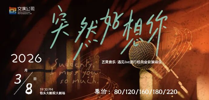演出信息演出信息《突然好想你》艺灵音乐·遇见LIVE流行经典金曲演唱会时间 | Date&Time2026年3月8日  19:30地点 | Venue包头大剧院·大剧场剧 院 地 址内蒙古自治区包头市青山区建设路南、建华路西