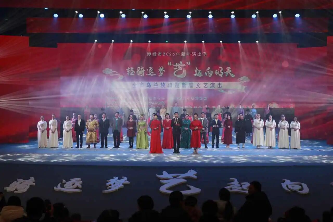 马头琴悠扬穿越红山风雪,民族舞蹁跹踏响新春节拍。1月16日晚,由中共赤峰市委宣传部、赤峰市文化和旅游局主办,赤峰市艺术剧院承办,阿鲁科尔沁旗、巴林右旗、巴林左旗、翁牛特旗、喀喇沁旗、宁城县乌兰牧骑联合协办的《轻骑逐梦 “艺”起向明天》全市乌兰牧骑迎新春文艺演出,在赤峰国际会展中心大剧院隆重上演。用饱含深情的艺术表达,为赤峰市各族群众献上了一场兼具民族特色与时代气息的文化盛宴,以文艺之力奏响辞旧迎新的奋进乐章。