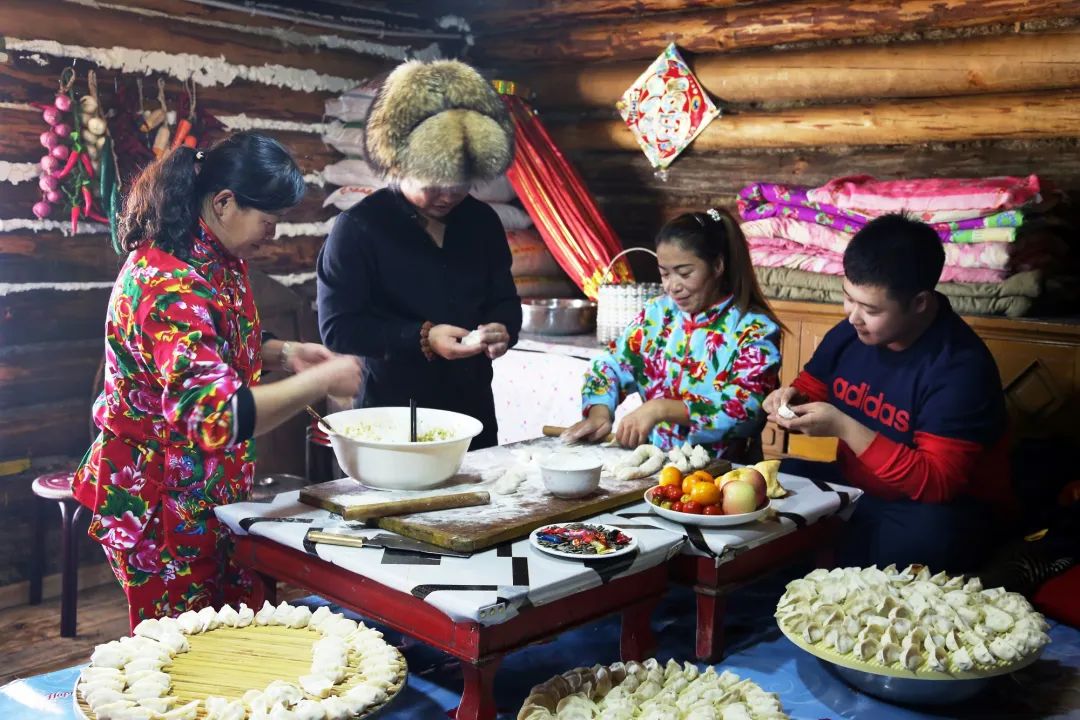 踏入冷极村,浓郁的东北年味扑面而来。屋檐下悬挂的红灯笼随风摇曳,映照出皑皑白雪,年味儿满满。大家一起动手包饺子,擀面皮、包馅料,欢声笑语中,形态各异的饺子摆满了桌,包进去的是对新年的美好期许。