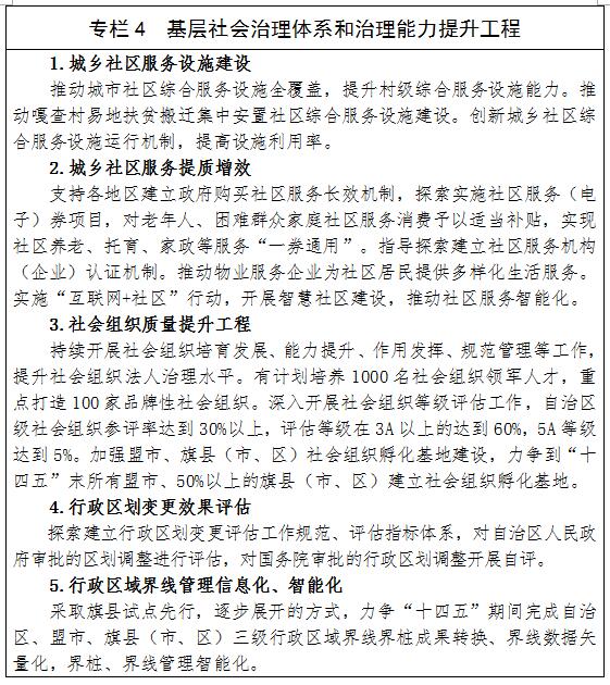 ——基层社会治理更加有序。体系完备、共治共享、和谐有序、群众满意的基层社会治理新格局基本建立。基层群众自治制度不断完善,城乡社区服务体系更加健全。社会组织在社会治理中的作用充分发挥。社会工作者、志愿者参与社会治理的途径进一步畅通和规范。慈善事业在第三次分配中的作用进一步凸显。行政区划在推进区域协调发展、新型城镇化建设中的功能进一步强化。