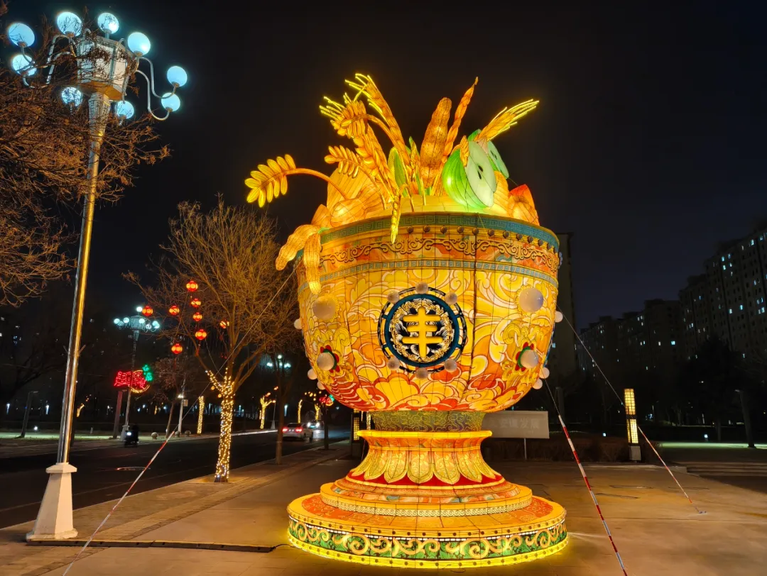 与此同时,13组大型主题灯组全部亮灯。高铁站北广场的“瑞灯贺春”以红金为主色调,传递团圆喜乐;百合园内“狮启福运”与“新春纳福”灯组动静结合,狮跃龙腾,寓意吉祥兴旺;黄河湾步行街沿线,“骏启鸿财”“十二生肖”“百花仙子”等灯组依次展开,融民俗文化与现代灯艺于一体,展现出一幅“马上迎福、百花报春”的生动图景。市政府南广场的“花开富贵”巨型花篮灯组,以百花簇拥之姿呼应“中华民族一家亲,同心共筑中国梦”的美好愿景;区政府广场的“五谷丰登”灯组则通过丰收意象,传递出踏实暖心的幸福感。据悉,此次亮化工程共采用节能灯具36类、2.5万余盏(件),兼顾环保性与艺术性。