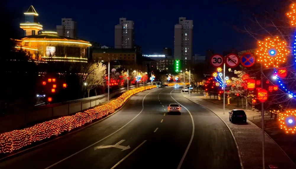 本次亮化围绕“福满临河·灯映新春”主题,重点打造7条主干道部分路段、4大城区出口、5处道路节点及12座公园广场。夜幕降临,金川大道两侧悬挂的“福韵灯笼”串联起一条绵延的“福运长廊”,寓意“福到万家、万象更新”;新华街分段呈现不同风格,维多利段七彩幻彩灯则勾勒出一条梦幻的“科幻走廊”,九完小段的炫酷圆球灯现代灵动,百货大楼段的国韵灯笼典雅庄重;胜利路点缀着暖色的藤球灯,如星光般柔和垂落,为街道增添温馨雅致的氛围;公园北街则以红色绒布灯笼与石榴灯妆点,搭配灯笼天幕。