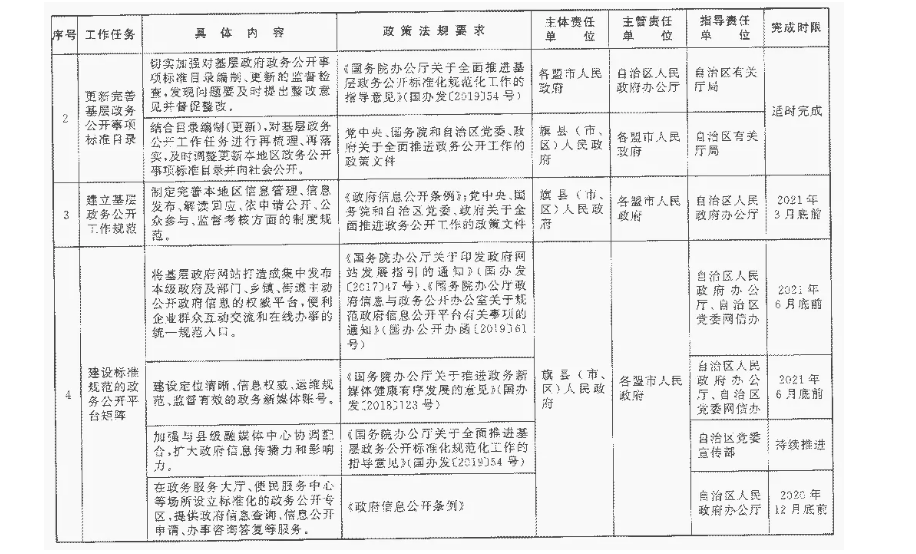 按照自治区政务公开领导小组部署,2020年10月底前,全面完成26个试点领域标准目录编制汇总工作,报盟行署审核后通过政府ld体育中国官方网站向社会公布,同时确保其他各项任务落实到位,有序推进;2020年12月底前,在政务服务大厅、便民服务中心等场所设立标识清楚、方便实用的政务公开专区,提供政府信息查询、信息公开申请、办事咨询答复等服务;2021年3月底前,各旗县市人民政府要制定完善本地区信息管理发布、解读回应、监督考核等方面的制度规范,建立基层政务公开工作规范;2021年底前,各旗县市人民政府要建设标准规范的政务公开平台矩阵,全面提升ld体育中国官方网站解读回应的效果,加强与政务服务的融合发展,完善基层行政决策公众参与机制,同时工作范围向农村牧区和社区延伸。
