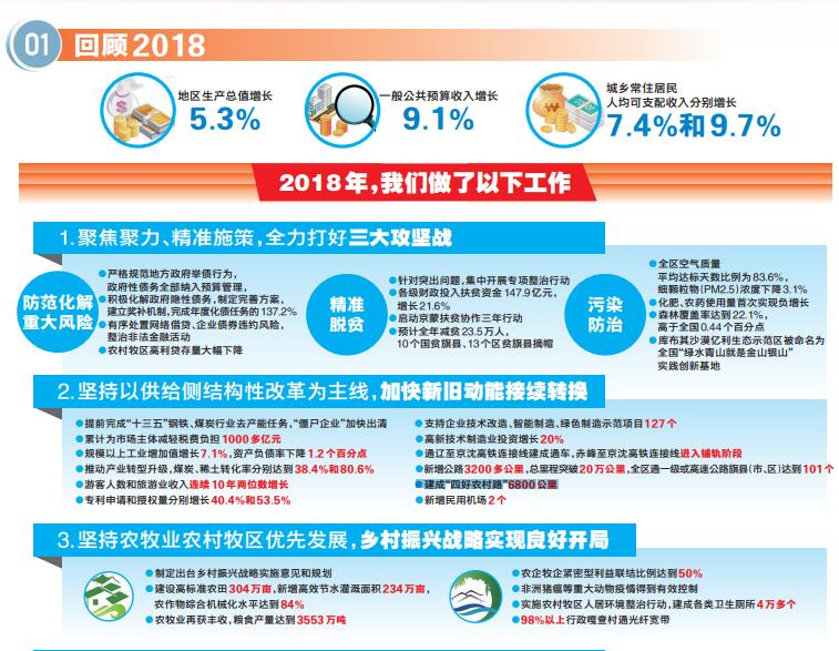 一年来,在以习近平同志为核心的党中央坚强领导下,我们深入学习贯彻党的十九大和十九届二中、三中全会精神,牢固树立“四个意识”,坚定“四个自信”,坚决做到“两个维护”,全面落实党中央、国务院决策部署,按照自治区党委工作部署,积极应对各种困难和挑战,锐意进取,扎实工作,全区经济社会持续健康发展。初步核算,地区生产总值增长5.3%,一般公共预算收入增长9.1%,城乡常住居民人均可支配收入分别增长7.4%和9.7%。