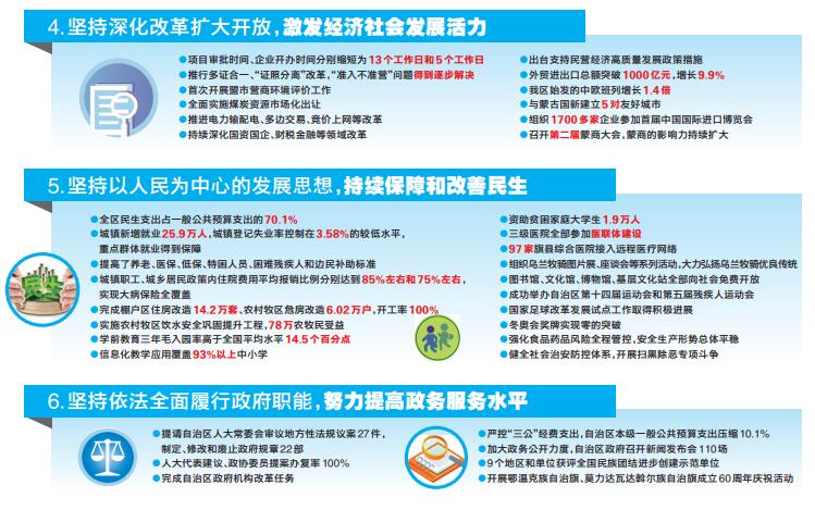 (四)坚持深化改革扩大开放,激发经济社会发展活力。深入推进“放管服”改革,项目审批时间、企业开办时间分别缩短为13个工作日和5个工作日。推行多证合一、“证照分离”改革,“准入不准营”问题得到逐步解决。首次开展盟市营商环境评价工作。针对政务服务工作中存在的形式主义、官僚主义问题开展明查暗访,推动解决群众烦心事。全面实施煤炭资源市场化出让。推进电力输配电、多边交易、竞价上网等改革。持续深化国资国企、财税金融等领域改革。出台支持民营经济高质量发展ld体育中国官方网站措施,设立企业纾困发展基金、流动性风险防控基金,帮助民营企业解决发展中遇到的困难和问题。