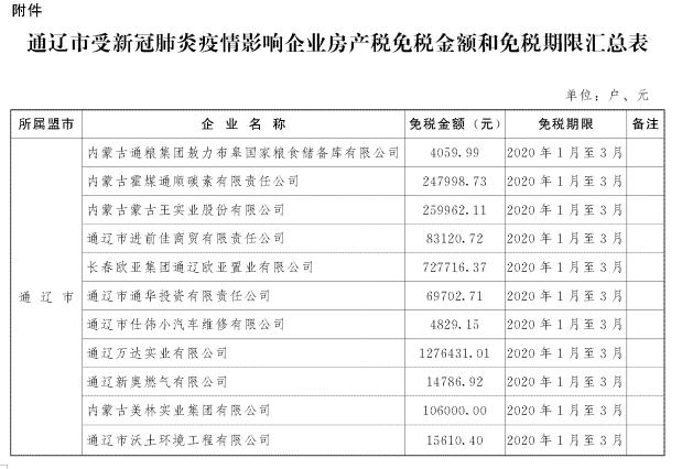 附件:通辽市受新冠肺炎疫情影响企业房产税免税金额和免税期限汇总表