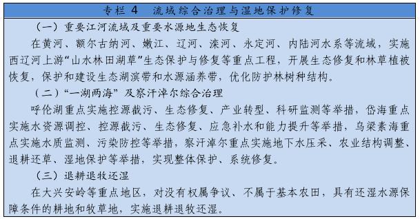 大力推进黄河生态带建设,统筹水环境、水生态、水资源、水安全、水文化,推进干支流一体化治理,突出抓好十大孔兑、多沙粗砂区集中来源区等水土保持治理,实施河道和滩区综合提升治理工程,完善水沙调控机制。深化“一湖两海”及察汗淖尔生态环境综合治理,创新区域系统治理和流域整体治理举措,逐步改善生态环境。全面加强嫩江、辽河、内陆河水系等流域和达里诺尔、乌拉盖等湿地生态保护修复,深入开展地下水超采综合治理。