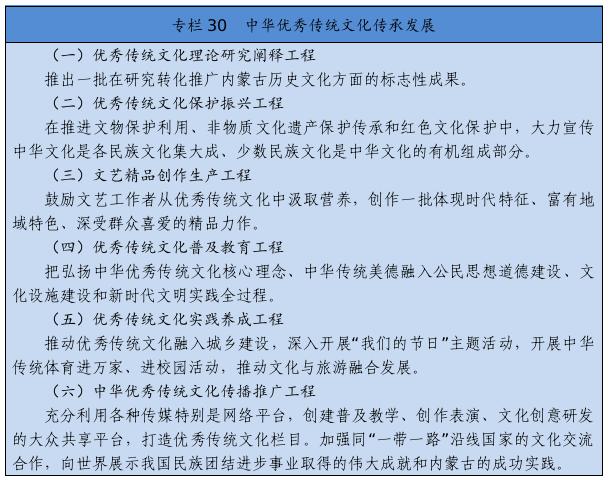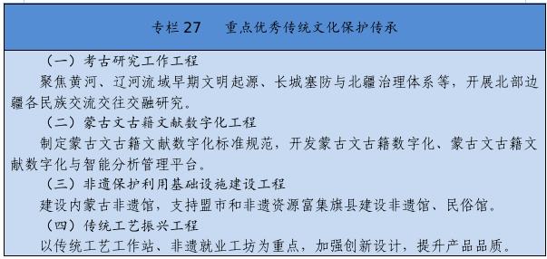 实施文化遗产系统性保护工程,强化重要文化和自然遗产、非物质文化遗产系统性保护,建立整体保护、活态传承、创新发展体系。实施重大文物保护工程,推进长城、黄河国家文化公园和大窑、辽上京、和林格尔土城子等国家考古遗址公园建设。推动万里茶道(内蒙古段)、辽上京和祖陵遗址、红山遗址群和阴山岩刻申遗。加强阿尔寨石窟寺等石窟文物保护。开展“中华文明探源”工程、“考古中国”河套地区早期聚落遗址考古发掘研究。建设内蒙古非遗博览园、内蒙古黄河文化博物馆、内蒙古工业博物馆。加强纪念馆、展览馆、博物馆建设管理。推进民族优秀传统手工艺保护传承和振兴,完善非遗名录体系。实施中华传统节日振兴工程,开展传统节日礼仪礼节教育活动。