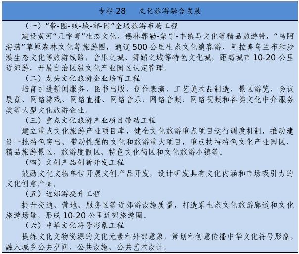 跨盟市打造大景区,跨区域布设“黄金线”,建设以生态为底色、以文化为特色、以旅游为产业支撑的“带-圈-线-城-郊-园”文旅融合发展格局。创建全域旅游示范区,推动东中西部旅游业差异化协调发展,东部地区重点推进生态旅游、边境旅游、冰雪旅游提档升级,打造呼伦贝尔国内一流草原森林生态和边境旅游目的地;中部地区重点发展文化遗产、草原风情、健康体育和休闲度假,打造呼和浩特现代休闲与会展旅游中心、鄂尔多斯文化体验和休闲旅游目的地;西部地区推动发展特色生态旅游、沙漠休闲和自驾越野,打造阿拉善国内知名西部风情旅游区。丰富创新高品质文化旅游产品供给,积极发展中高端旅游,提供个性化定制服务,大力发展红色旅游、马文化旅游、康养旅游、研学旅游、体育旅游、边境旅游和刺绣产业。推动旅游景区提档升级,开展文化演艺、非遗和文创产品进景区活动,加快建设智慧旅游景区、跨境旅游试验区。创建乡村旅游重点村,培育乡村旅游融合发展示范区。完善旅游公共服务设施,提升旅游咨询中心、公共停车场、旅游厕所等服务功能。统筹“风景道+景区+乡村+自驾车营地”,建立健全自驾游服务体系。整合利用公路、高铁和航空网络,构建安全便捷的全域旅游交通体系。实施文化和旅游品牌战略,统筹做好旅游营销。实施文化旅游资源开发利用工程,组织开展全区文化和旅游资源普查,建立文化和旅游资源数据库。