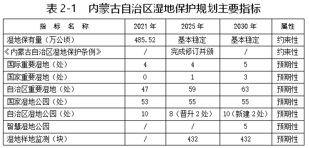 2.具体目标。到2025年末,推动完成《内蒙古自治区湿地保护条例》的修订颁布工作。到2030年末,全区湿地面积保持基本稳定;争取晋升国际重要湿地1处、国家重要湿地3处、自治区重要湿地16处;晋升国家湿地公园2处;拟新建自治区级湿地公园2处、自治区级自然保护区1处;推进7处国家湿地公园(试点)建设验收;建设5处智慧湿地公园;持续开展林草湿综合监测432个湿地固定样地和变化图斑调查,建立全区湿地天—地—空监测、评估、预警体系。(详见表2-1)