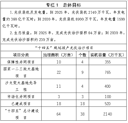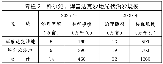 (二)总体目标。配合“三北”六期等生态治理工程,实施全区沙漠、沙地光伏治沙规模化开发,助力库布其沙漠、乌兰布和沙漠、毛乌素沙地等重点区域得到系统治理,科尔沁、浑善达克两大沙地可治理部分得到全覆盖治理,巴丹吉林、腾格里两大沙漠锁边工程加速推进,沙漠南侵趋势得到有效遏制。到2025年,光伏治沙装机规模超2140万千瓦,年发电量约360亿千瓦时,完成光伏治沙面积64万亩;到2030年,光伏治沙装机规模8900万千瓦,年发电量1500亿千瓦时,完成光伏治沙面积约230万亩,板下经济快速增长。