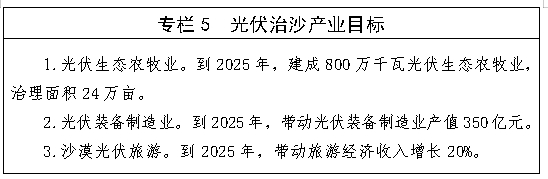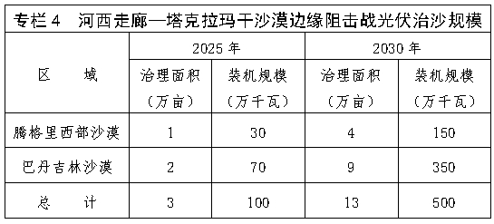 (三)推进林光互补的光伏治沙模式,助力打赢河西走廊—塔克拉玛干沙漠边缘阻击战。在腾格里西部沙漠、巴丹吉林沙漠及周边,避开高大密集型沙丘和沙丘链,采用抗扬沙、高效率的光伏技术集中连片布置光伏项目。到2025年建成光伏装机100万千瓦,到2030年建成500万千瓦。推广种植梭梭、驼绒藜等超旱生灌木,蒙古冰草等牧草,形成种植耐旱、固土的多年生草本植物为主的防风固沙治理模式。到2025年完成治沙面积3万亩,到2030年完成治沙面积13万亩。
